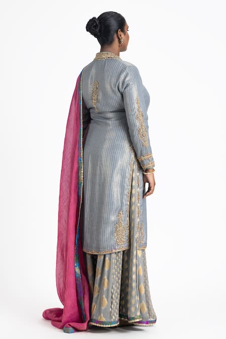 Grey angrakha style kurta featuring stripe woven motifs and zardozi embroidered neckline and sleeve hem in floral pattern. Paired with a multi banarasi panelled sharara and floral brocade woven dupatta on edges.