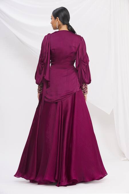 Dark cherry cowl draped short tunic with bishop cuff sleeves, gathered pleats & placement floral motif work. Comes with lehenga.