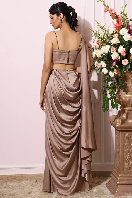 Peach satin pre stitched saree with basket weave texture & 3D floral shoulder knot. Comes with embellished blouse.