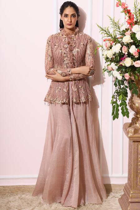 Almond pink peplum blouse with embroidered floral work. Paired with kalidar pants.