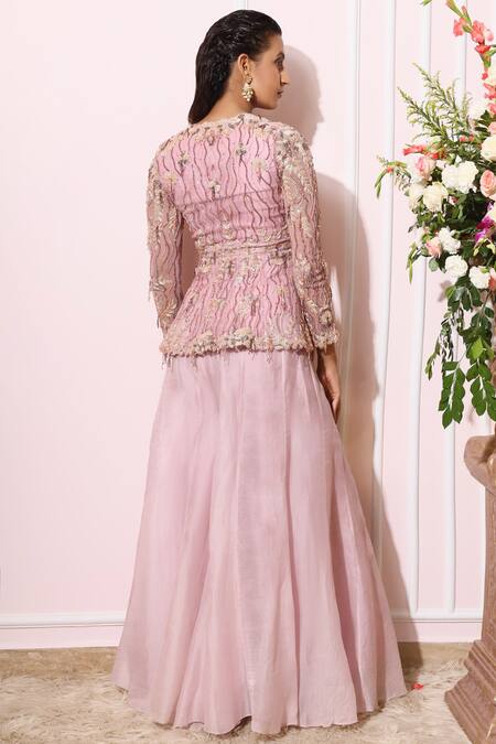 Lavender peplum blouse with embroidered floral work. Paired with kalidar sharara pants.