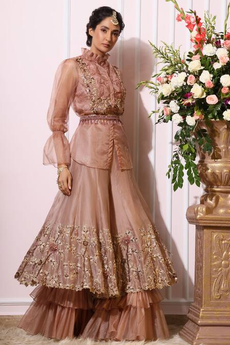 Buy_Nitika Kanodia Gupta_Pink Organza, Crepe High Neck Embroidered Pant Set_at_Aza_Fashions
