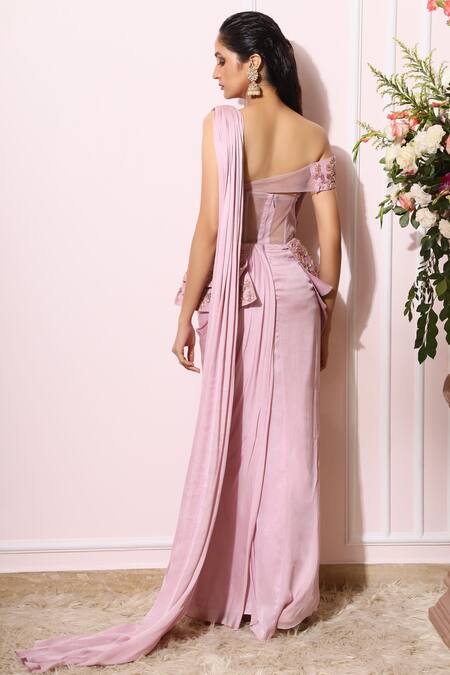 Lavender pre-stitched saree gown with asymmetric embroidered layered yoke.