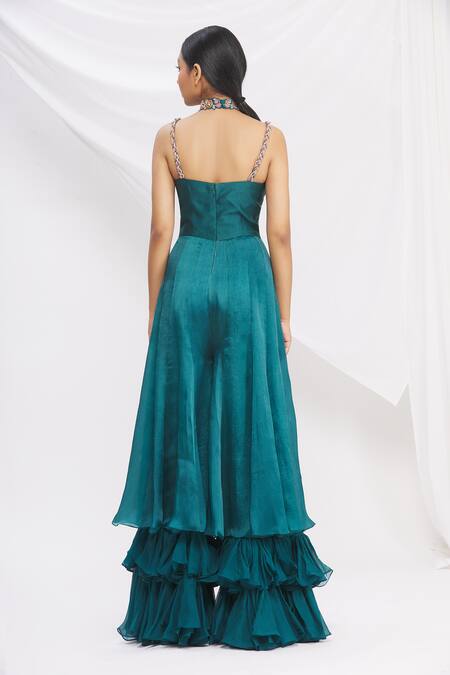 Dark teal layered sharara-style jumpsuit with placement floral motif work & bead embellished spaghetti straps. Comes with detachable organza dupatta & layered choker.