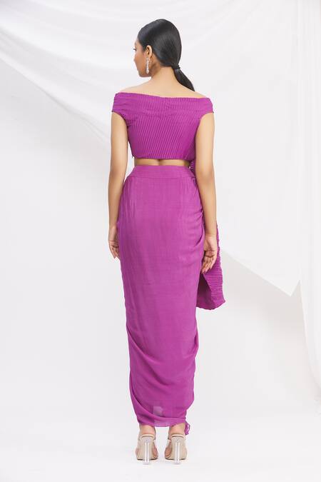 Fuchsia off shoulder top with all-over pleated & drape detail. Paired with ruffle draped & pleated skirt.