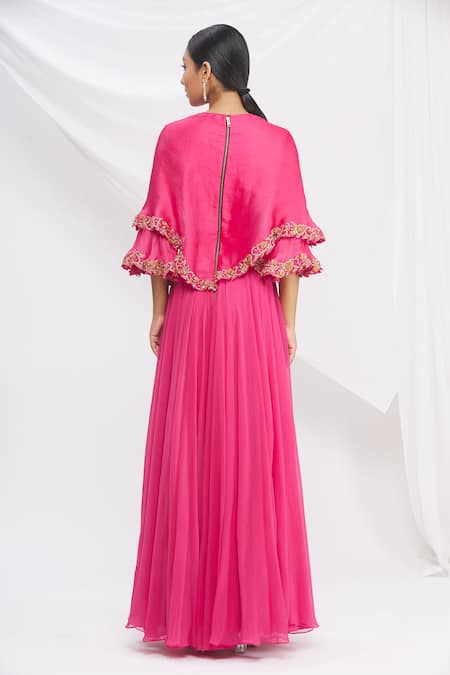 Persian pink flared gown with placement 3D floral motif work, cape-style overlay & cutwork detail.