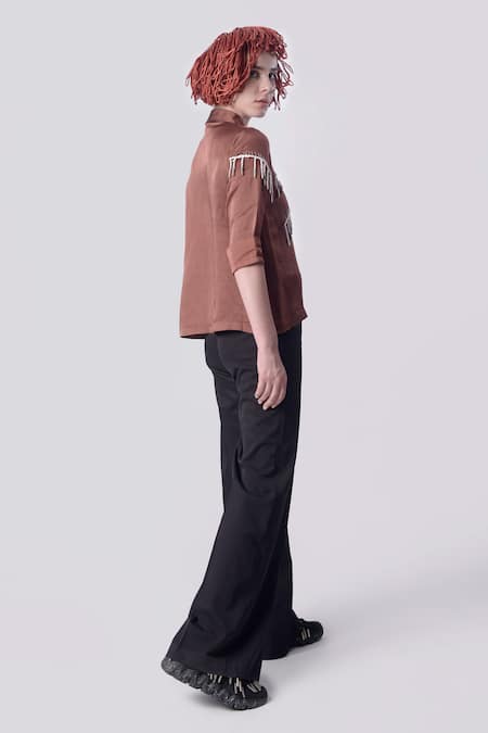 Brown shirt featuring 3D bead and cord tassel embellishments. Paired with black pants for a complete look.