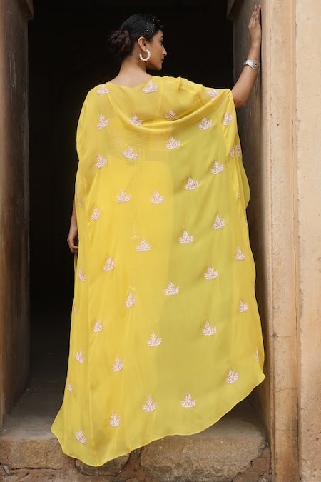 Buy_Nitisha Kashyap Official_Yellow Crepe, Georgette, Silk Sequins, Cut Work, Embroidered Cape Skirt Set _Online_at_Aza_Fashions