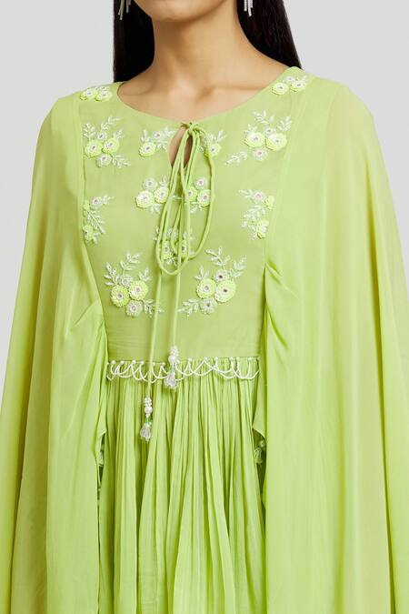 Green georgette kaftan featuring round neckline, flared sleeves, and beads & mirror embroidery. Paired with a gharara that has a side zip closure.