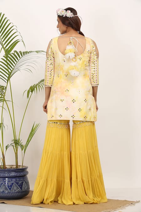Peach kurta featuring cold shoulder sleeves with intricate bead, sequins, and thread embroidery. Paired with a yellow gharara and matching dupatta, enhanced with scallop detailing and attached lining.