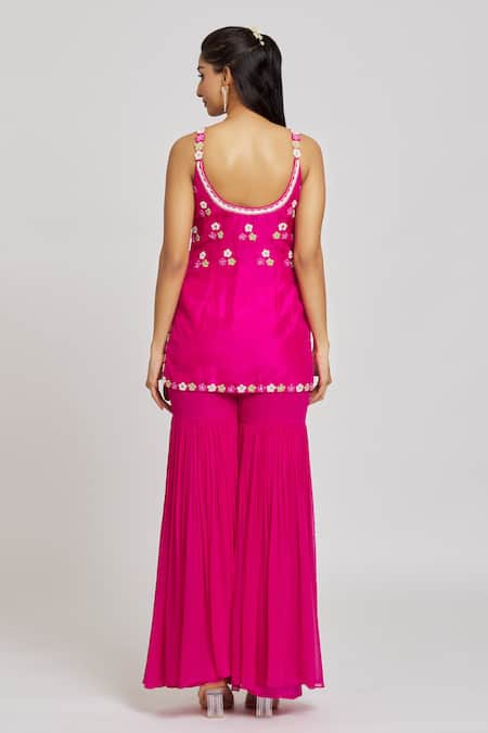 Pink kurta featuring bead floral motif embroidery on the bodice. Paired with a matching gharara and dupatta with floral applique work.