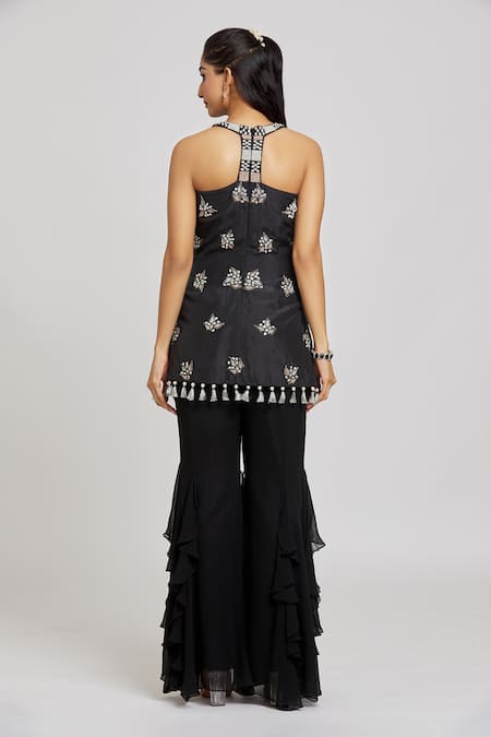 Black silk padded kurta with mirror, resham, and bead embroidery. Paired with black frill sharara and net dupatta, featuring attached lining.