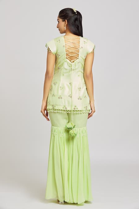 Light green silk kurta featuring resham, mirror, and bead embroidery with a round neckline and cap sleeves. Paired with a matching georgette gharara and a net dupatta, both adorned with tassels.