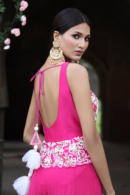 Fuchsia peplum top featuring all-over floral embroidery with sequins, beads, and zari work. Paired with a matching sharara pant and a scallop bordered dupatta.