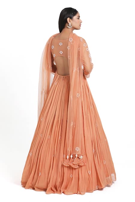 Peach anarkali featuring round neckline, three quarter sleeves, and hand embroidery with cutdana, mirror, thread, and beads. Paired with a matching dupatta and attached lining.