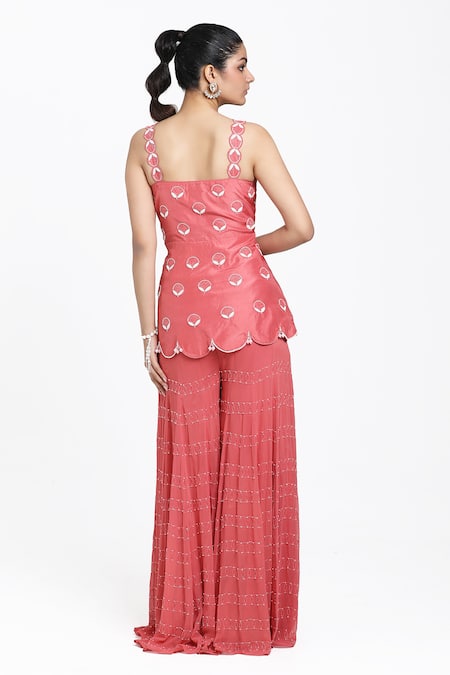 Onion pink hand embroidered kurta featuring a sweetheart neckline and sleeveless design with cutdana, resham, and bead work. Paired with a sharara and a matching dupatta.