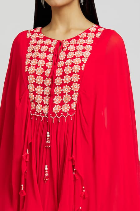 Red georgette kaftan featuring beads and mirror embroidered circles. Paired with a matching gharara that has a side zip closure and embellished hem.