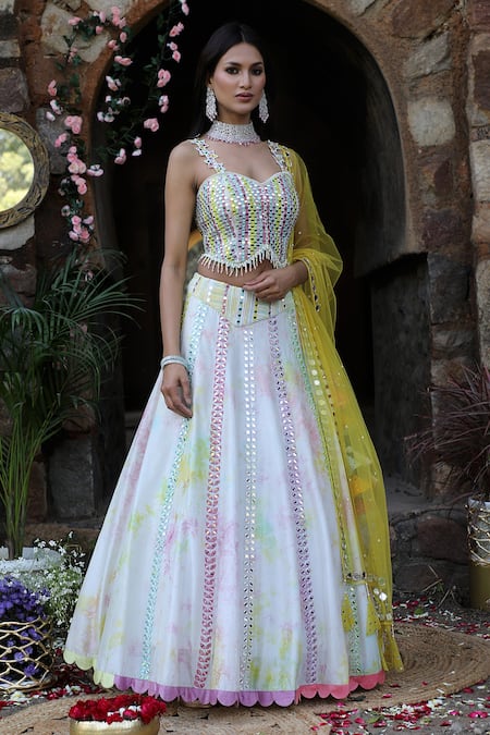 Multi color lehenga featuring tie and dye pattern with mirror embroidery detailing. Paired with an embroidered padded blouse and matching dupatta.