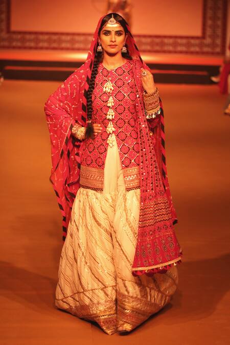 Red kurta featuring ajrakh geometric hand block print and sequin embroidery. Paired with a gota stripe embroidered sharara and scallop bordered dupatta.