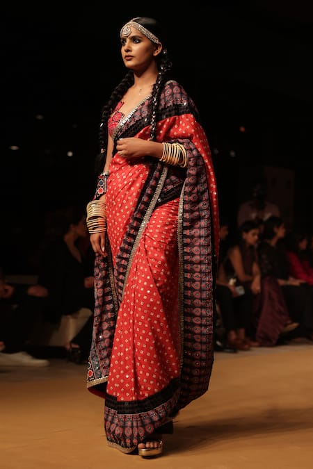 Red saree featuring bandhej and ajrakh hand block print with embroidered border. Paired with a sleeveless printed blouse.