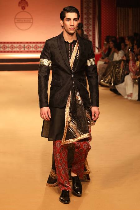 Black floral woven blazer featuring a shawl collar and full sleeves. Paired with a sheer shirt, maroon ajrakh hand block printed pant, and gota lace border embroidered dupatta.