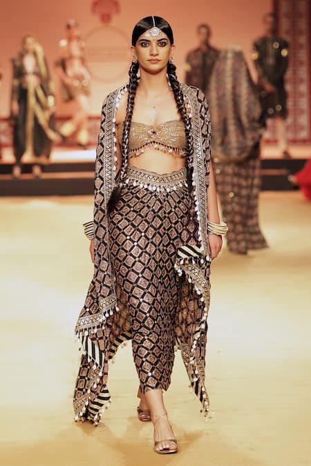 Black draped skirt set featuring a sleeveless blouse with a sweetheart neckline and a black cape with flared sleeves. Embellished with ajrakh hand block printing, sequins, and shell embroidery.
