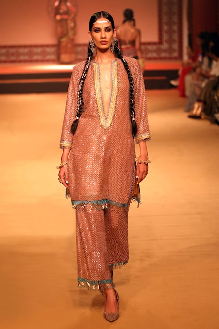 Buy_Nitya Bajaj_Gold Georgette Beads, Sequins V-neck Work Tunic And Pant Set_at_Aza_Fashions