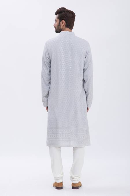 Grey kurta featuring all-over fish-scale motif embroidered with sequins spread. Paired with a pyjama.