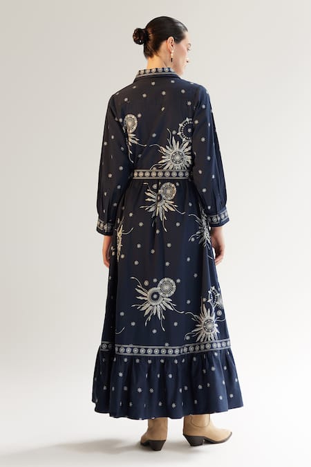 Blue Cotton Satin Tassels Collared Celia Starstruck Print Dress