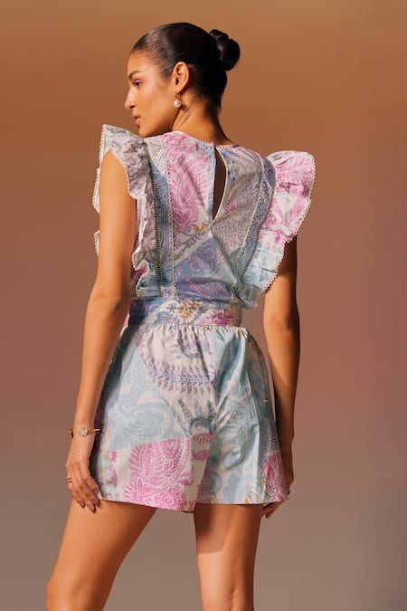 Multi-color playsuit featuring paisley print all over with ruffle detailing