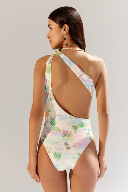 Multi color monokini featuring a digital print with a one-shoulder design