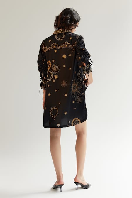Black Cotton, Silk Collared Thais Starstruck Print Dress
