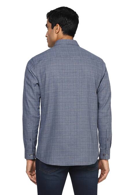 Blue shirt with checkered motifs, typography placement embroidered motif & front button placket.