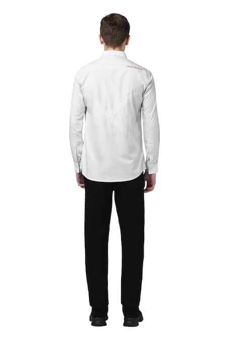 Off white shirt with typography embroidered detail & fabric manipulation detail.