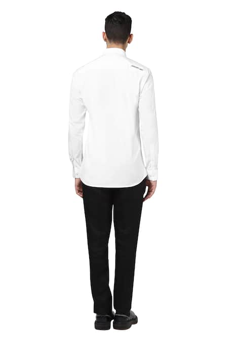Off white shirt with laser lines, typography embroidered detail & front button placket.