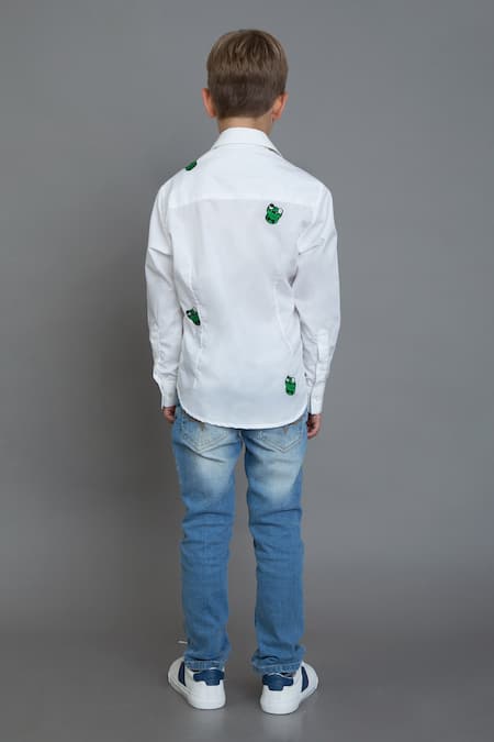 White slim fit shirt featuring frog embroidered motifs and a front button placket