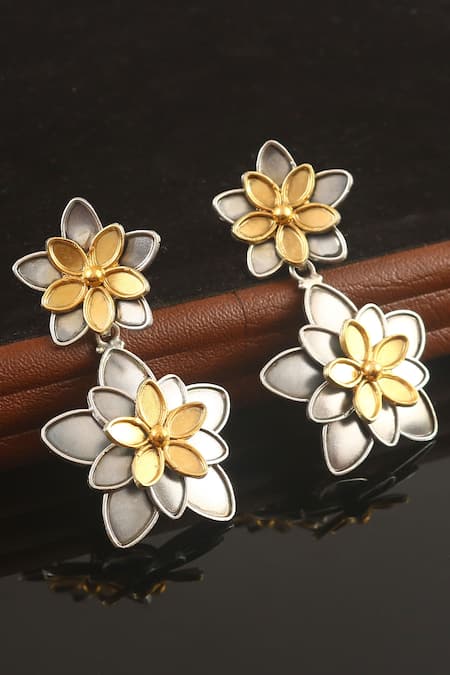 Silver dangler earrings featuring floral carved detailing with gold accents