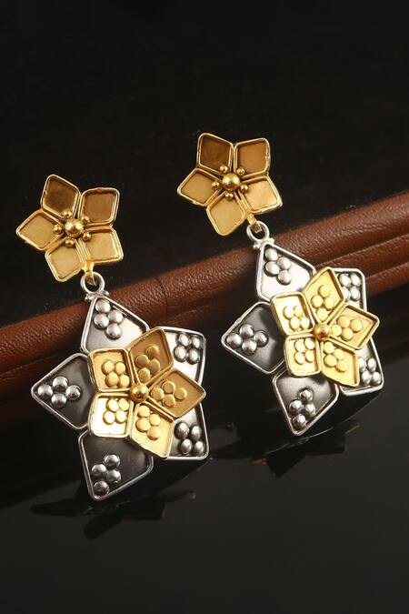 Floral carved detailing on the earrings, Mixed metal finish with gold plating, Pushback clasp for secure wear
