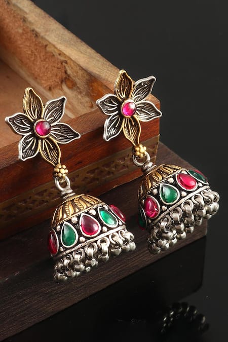 Gold plated jhumkas featuring a carved floral design on top with stone embellishments