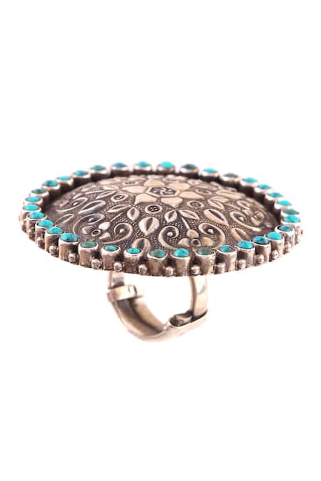 Floral carved design with intricate detailing, Turquoise gemstone embellishments, Adjustable size feature