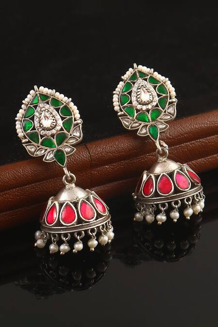 925 sterling silver jhumkas featuring intricate kundan jadau work. Dimensions measure 5 cm in length.