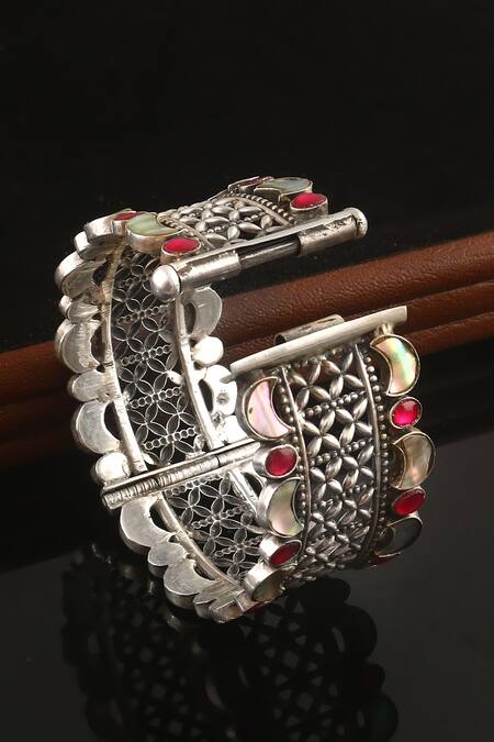 Intricate Kundan detailing on the bangle, Unique silver tone with colored stones, Artistic cutwork design