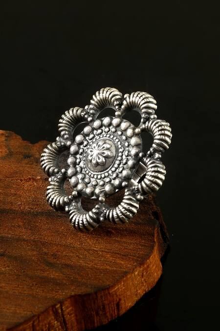 Buy_Noor_Silver Plated Oxidised Floral Shaped Ring_at_Aza_Fashions