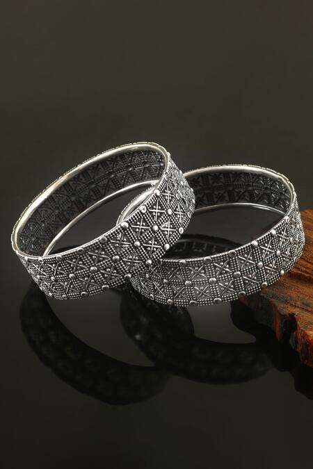 Silver bangles featuring intricate geometric pattern carvings. Set includes two handcrafted bangles with a slip-on style.
