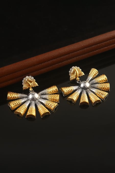 Intricate peacock carving on the dangler, Combination of gold plating with sterling silver, Unique fan-like design with detailed engravings