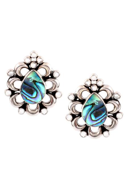 Silver toned handcrafted stud earrings featuring mother of pearl and stone embellishments