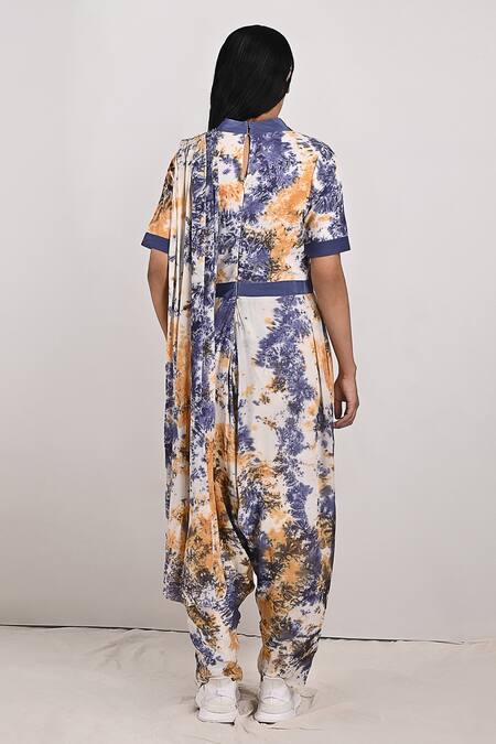 Cream jumpsuit saree with tie & dye print, pleated detail & V neckline.