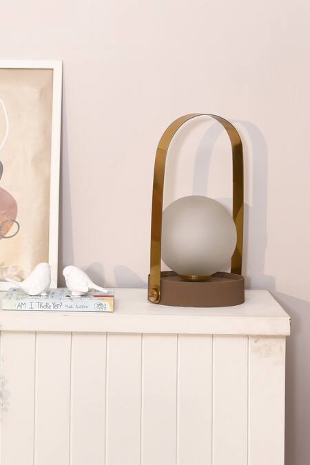 Taupe table lamp with a dome shaped top, circular base and gold handle.