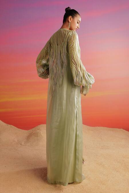 Green maxi dress featuring a round neckline and bell sleeves with cutdana and sequin embellishments. Comes with a sleeveless inner slip for added comfort.