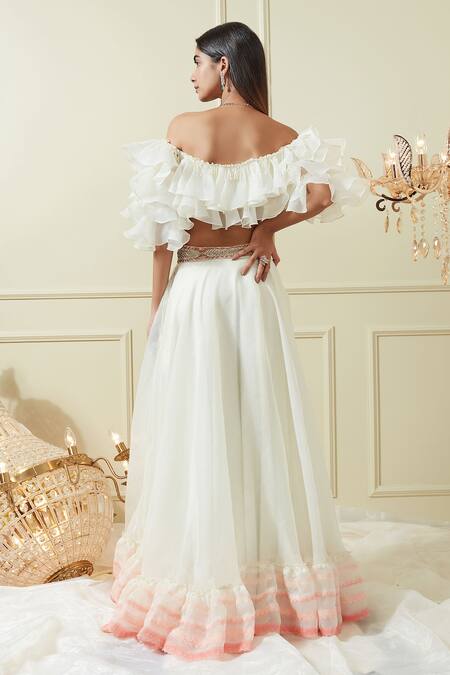 White Organza Embroidery One Shoulder Off Blouse And Lehenga Set
